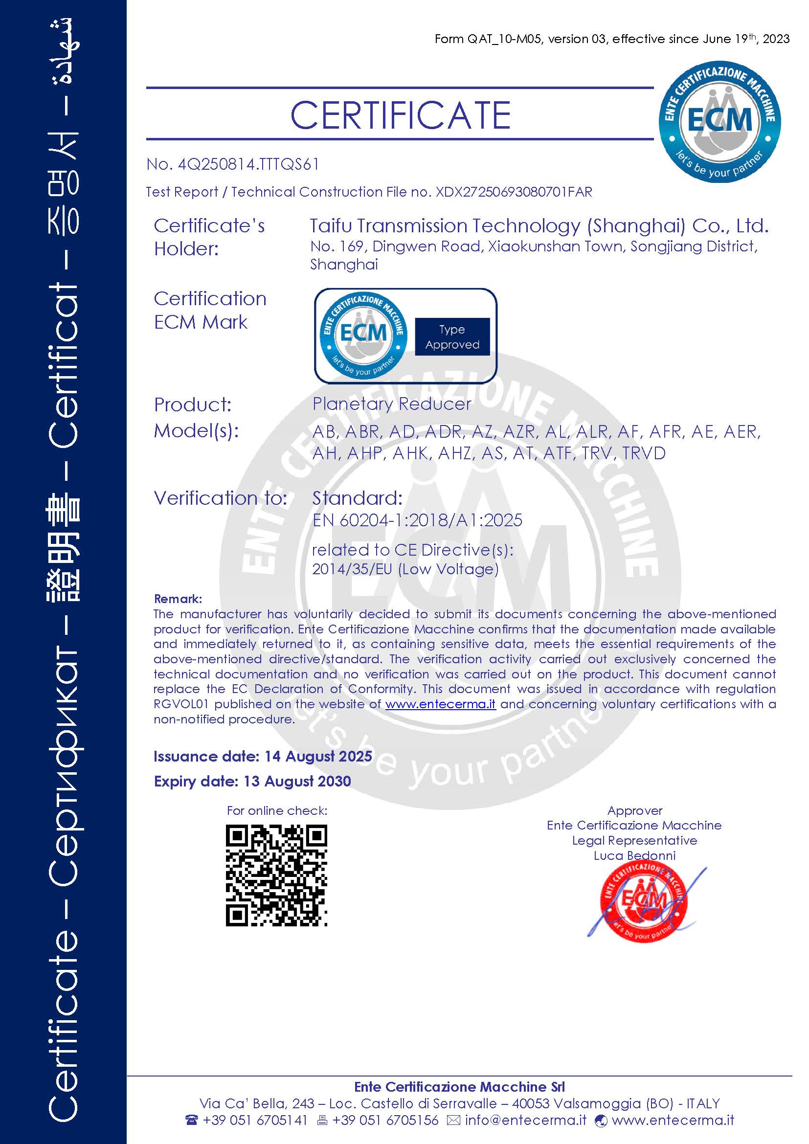 熱烈祝賀太弗傳動(dòng)科技(上海)有限公司通過(guò)EN 60204-1:2018/A1:2025標(biāo)準(zhǔn)...